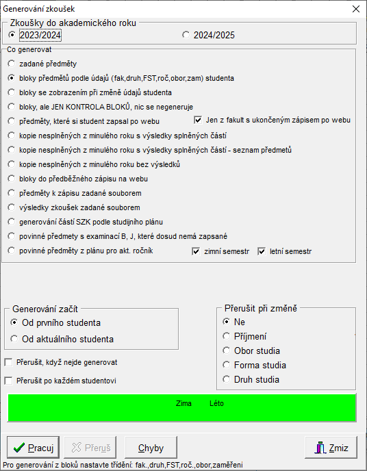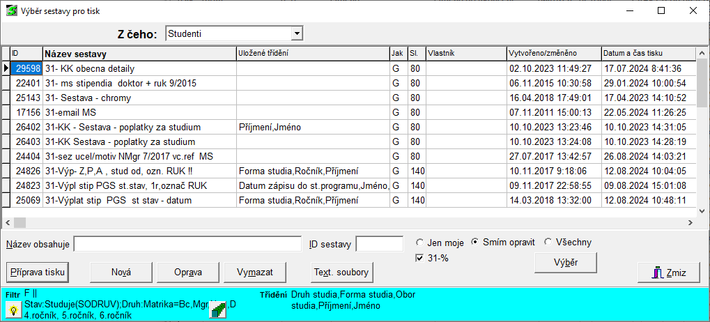 Zejména ve spodní části formuláře jsou v levé části údaje o tzv. filtru - tj. jací studenti jsou právě vybráni (např. z jednoho oboru nebo jen určitý ročník, ...).