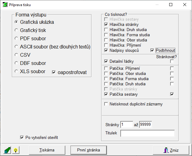 - pak se specifikují parametry tisku - kde se tisknou jaké hlavičky a patičky, rozsah tisku, formát výstupu, ...