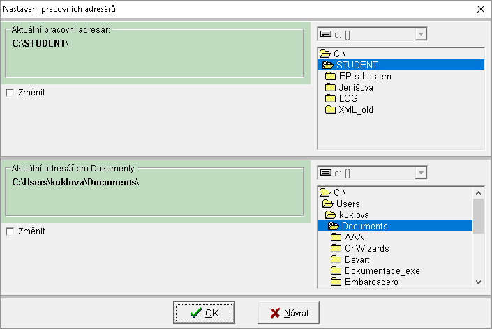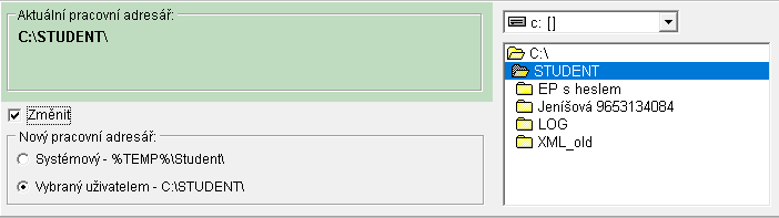 V programech Student, Uchazeč, Parametry, Tajemník a Správce je možnost nastavit pracovní adresář a adresář pro dokumenty.
