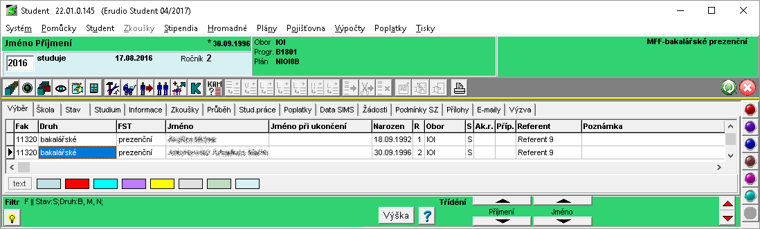 - Student - program pro vedení studijní agendy včetně počítání stipendií, vedení agendy zdravotního pojištění studentů, vytváření matriky studentů a k převodu přijatých uchazečů z programu Uchazeč do programu Student. Dále umožňuje správu studentských a doktorandských předmětů, bloků předmětů a studentských prací.