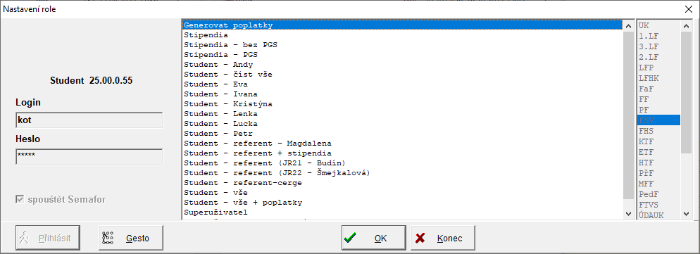Poté systém STUDIUM ověří, zda zadané údaje jsou správné. V kladném případě si uživatel vybere roli, v níž bude v systému STUDIUM vystupovat: