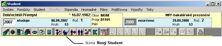 Novou osobu nebo přesněji osobní údaje nového studenta lze založit volbou Student-Nový student/studium (kombinace kláves Ctrl+N) nebo ikonou Nový student.