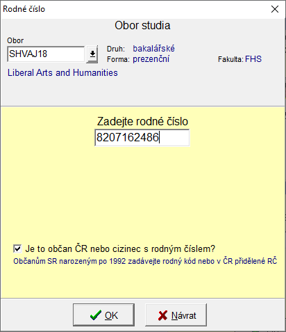 Zobrazí se okno Rodné číslo, kde je třeba nejdříve zvolit kombinaci obor, druh a forma studia. Dále je třeba zadat rodné číslo osoby.