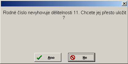 Po potvrzení rodného čísla tlačítkem OK se provede kontrola správnosti rodného čísla. Kontroluje se dělitelnost rodného čísla jedenácti. Nevyhovuje-li rodné číslo této podmínce, lze jej přesto uložit, pokud potvrdíte dotaz zobrazený v okně na následujícím obrázku.