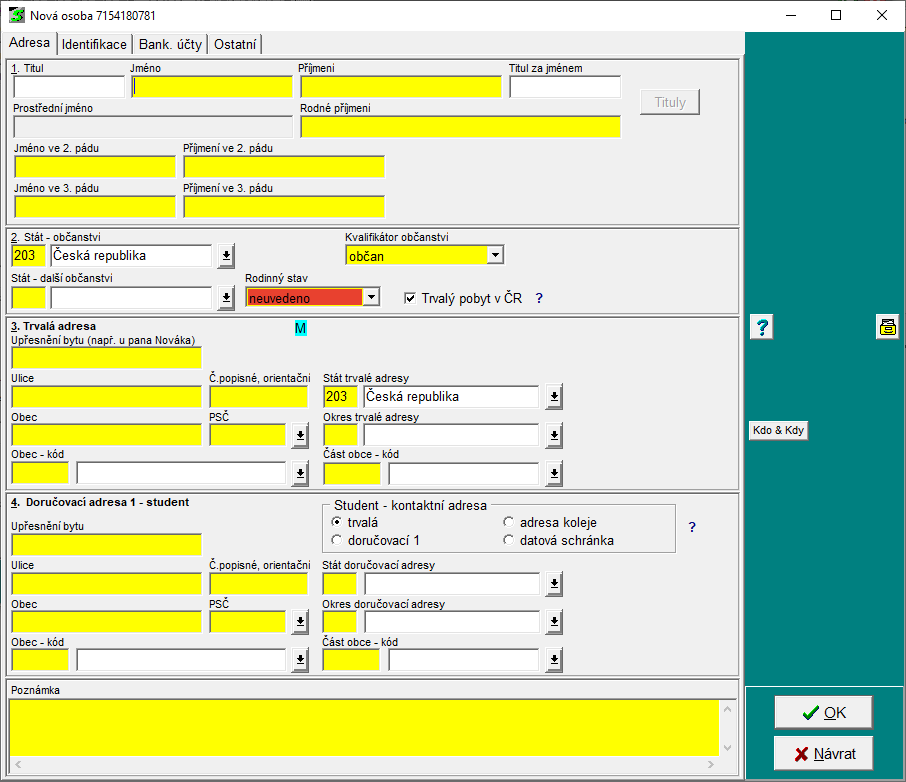 Poznámka: I u existující osoby je vhodné při zadání nového studia zkontrolovat osobní údaje, protože mohou být staré.