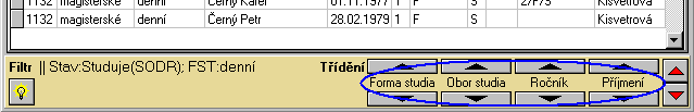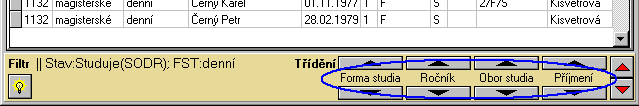 - podle formy studia, oboru, ročníku, příjmení - znamená to, že nejprve se studenti rozdělí podle forem studia (denní, externí, ...), v rámci každé formy studia se rozdělí podle oborů (biologie, chemie, ...), v rámci oboru se seřadí podle ročníků a pak teprve abecedně, na obrázku je vidět spodní část formuláře s údaji o studentech