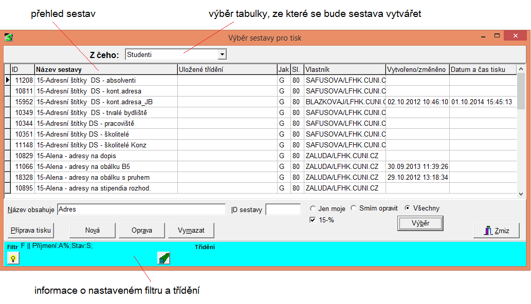 - Další zaškrtávací políčko v tomto okně zužuje výběr sestav na vlastní fakultu (tato podmínka platí za předpokladu, že dodržujete úmluvu o názvu sestav: název každé sestavy začíná znaky XX-, kde XX je číslo fakulty).