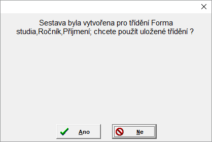 - pokud má sestava uložené třídění a toto třídění je odlišné od nastaveného třídění, vyvolá se dotaz, zda chcete použít uložené třídění