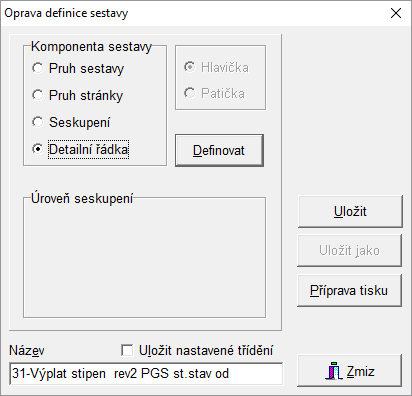 - přepínačem Uložit nastavené třídění se specifikuje, zda se momentálně nastavené třídění má uložit do definice sestavy
