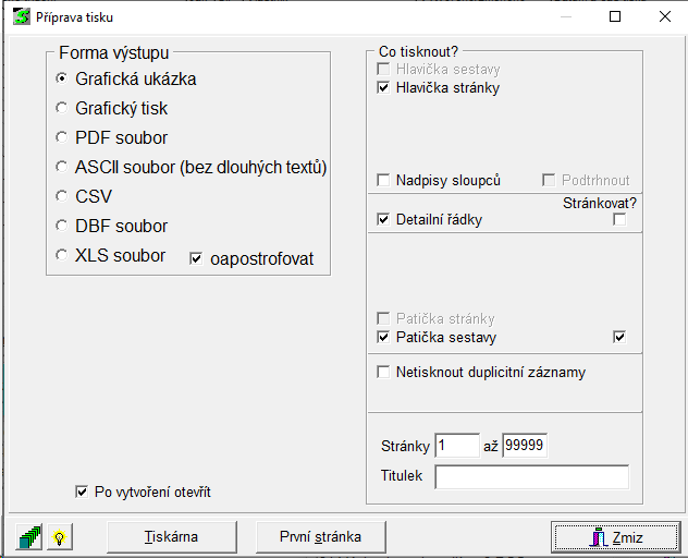 Poznámka: Z vybraných stránek (např. stránek 5 až 10) lze posléze u textových sestav vybrat pouze některé listy, které se nakonec vytisknou na tiskárně.