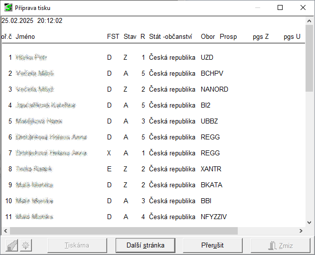 - grafická ukázka - tlačítkem První stránka se vyvolá náhled na vytvořenou tiskovou sestavu ve speciálním okně, tlačítkem Přerušit je možné náhled přerušit a vrátit se do okna Příprava tisku, tlačítkem Další stránka se zobrazí další stránky náhledu