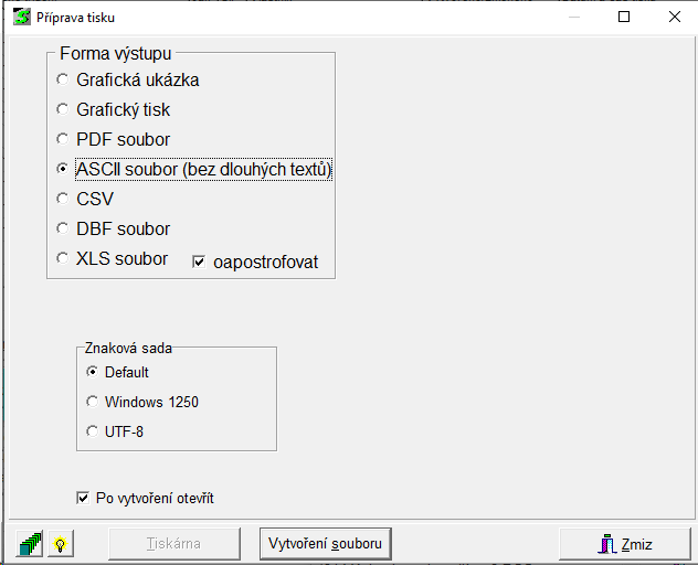 - DBF soubor- kóduje se vždy v kódu Latin II, tlačítkem Vytvoření souboru se zobrazí dialog pro uložení souboru v databázovém formátu DBF, poté se spustí vytvoření souboru