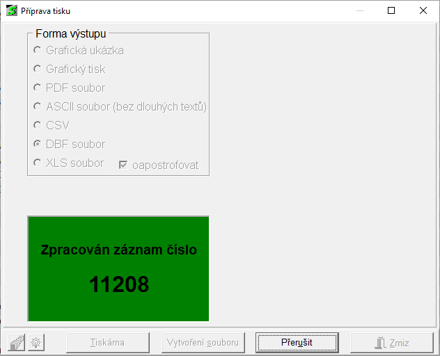 V průběhu vytváření textové sestavy, ASCII souboru či DBF souboru se zobrazí v levém dolním rohu okna počitadlo záznamů (viz obrázek), které informuje uživatele o počtu již zpracovaných záznamů. Tlačítkem Přerušit lze vytváření tiskové sestavy ukončit.