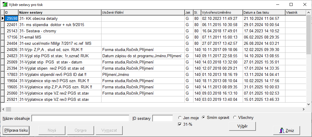 Poznámka – V sestavě pro jednoho studenta jsou tlačítka Nový, Oprava a Vymazat znepřístupněna. Sestavu lze pouze tisknout.