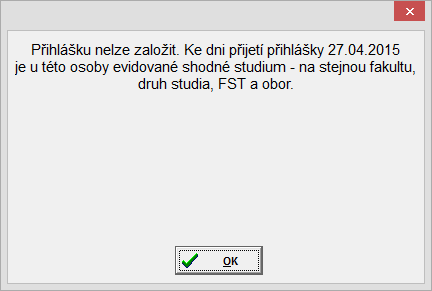 • Zjišťuje se aktivní studium (vše mimo stud. stavu A, Z) ke dni přijetí přihlášky. Pokud se takové studium najde, program toto oznámí a nedovolí přihlášku založit.