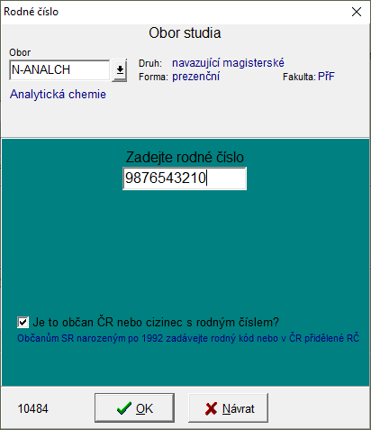 Zobrazí se dialogové okno pro zadání rodného čísla osoby, dále je nutné ještě vybrat také druh, formu a obor zakládaného přihlášky.