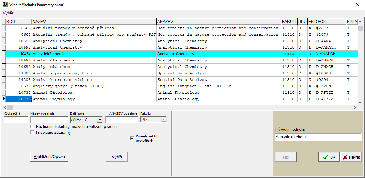 • Tlačítko otevře číselník Parametrů oborů, ve kterém se nabízí všechna povolená studia pro přihlášku.