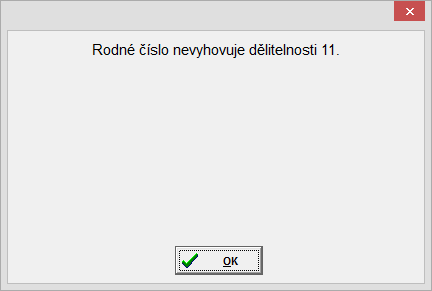 • Zadání rodného čísla se potvrdí volbou OK. Pokud není rodné číslo zadáno správně, objeví se příslušné hlášení, např.: