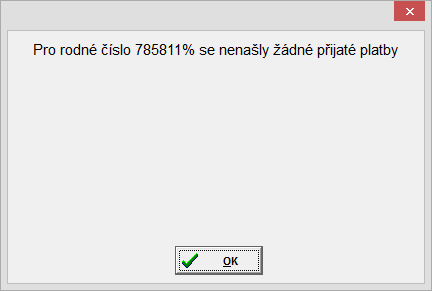 • 606.png  tlačítko Přijaté platby - pro zadané rodné číslo se vyvolá přehled přijatých plateb nebo se zobrazí hlášení: