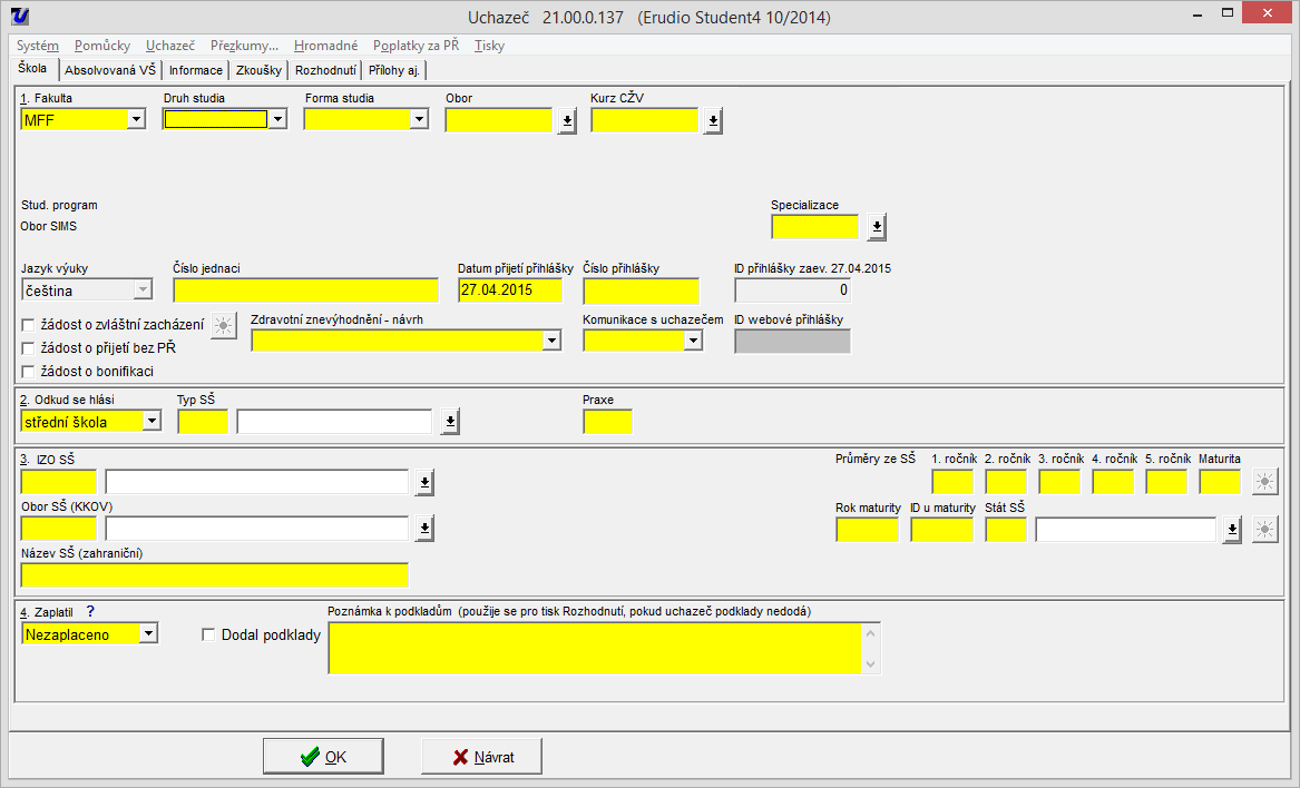 Pokud zadané rodné číslo v databázi ještě neexistuje, zobrazí se prázdný formulář nové osoby s barevně odlišenými vstupními poli, do nichž se vyplní osobní údaje uchazeče z přihlášky.