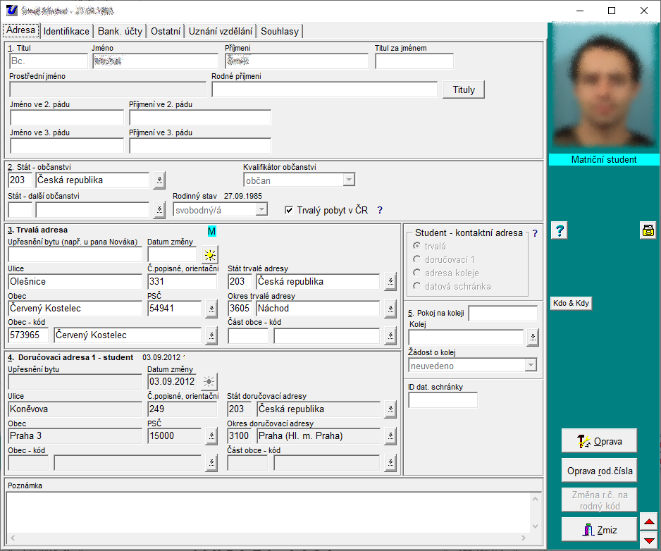 Popis jednotlivých položek i karet je shodný s popisem u Studenta - viz Evidenční údaje osoby