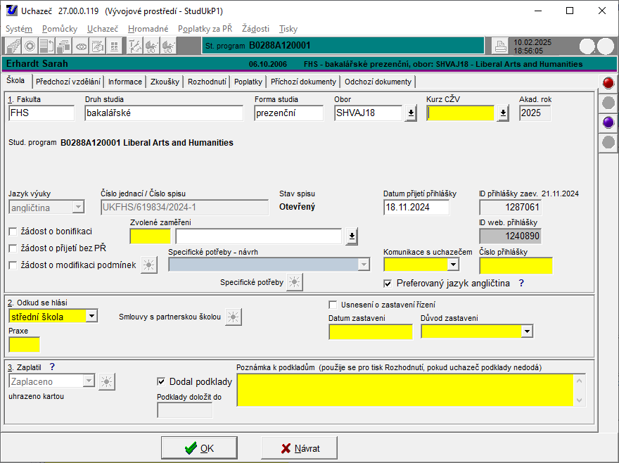 , se vyvolá formulář s údaji z přihlášky, jak ukazuje další obrázek. Údaje jsou v editačním režimu a lze je upravovat.