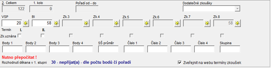 Dojde-li ke změně dat položek Zk1 - Zk8, která nepřepočetla výsledek přij. řízení (kód nepřijetí), zobrazí se u položky Výsledek přij. řízení tučný červený text