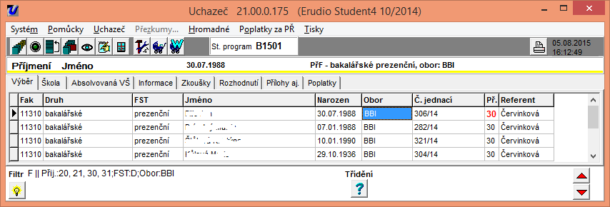 Skupina - číselné označení skupiny, využívá se buď pro přijaté uchazeče a jejich rozdělení do studijních skupin nebo pro libovolné jiné rozdělení uchazečů (např. pro přijímací zkoušky)