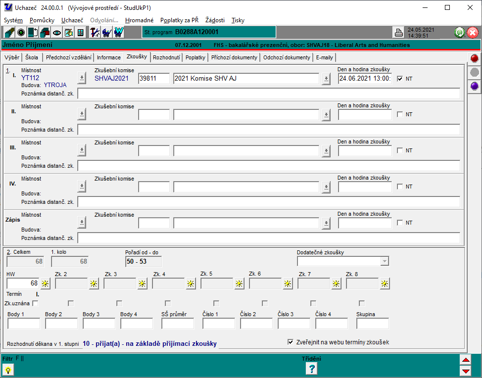 Tato kapitola se věnuje údajům na stránce Zkoušky. Zde jsou obsaženy informace o výsledcích a průběhu přijímacího řízení.