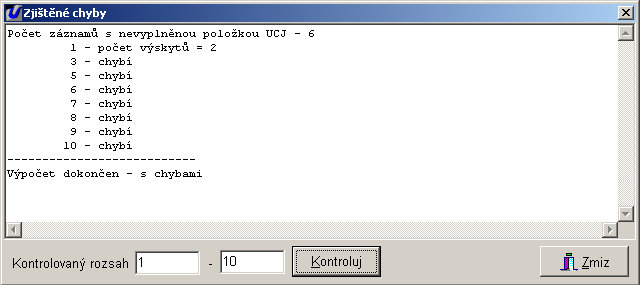Po kladné odpovědi se kontrola spustí a výsledkem je okno se zjištěnými chybami – například duplicity jednacích čísel nebo chybějící jednací číslo.
