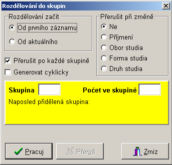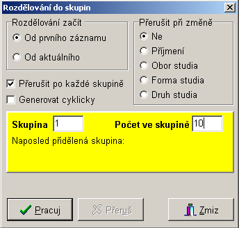 Poznámka: Tato volba je potřebná, když se rozděluje do skupin rozdílný počet lidí. - generovat cyklicky – je-li tento přepínač zaškrtnutý, vyvolá se rozdělování, které nelze zastavovat po každé skupině, místo počtu ve skupině se stanovuje počet skupin a přidělování skupiny proběhne tak, že první uchazeč se přiřadí do skupiny, jejíž číslo je v položce skupina, další uchazeč se přiřadí do skupiny o 1 vyšší, atd. a po vyčerpání všech povolených čísel skupin se další uchazeč přiřadí opět do skupiny, jejíž číslo je v položce skupina
