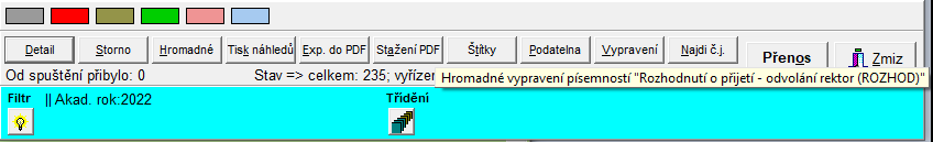 Tlačítkem "Vypravení" je možno vygenerovaná "Rozhodnutí o přijetí - odvolání rektor" (ROZHOD) hromadně vypravit.