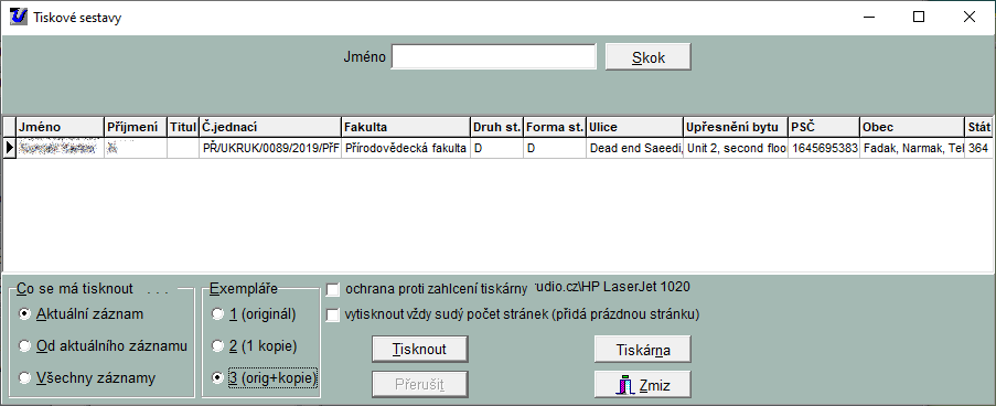 Kliknutím na tlačítko "Tisk náhledů" se otevře okno tiskové sestavy (viz. obrázek). Zde určíme, co a kolikrát se má tisknout, eventuálně nastavíme tiskárnu.