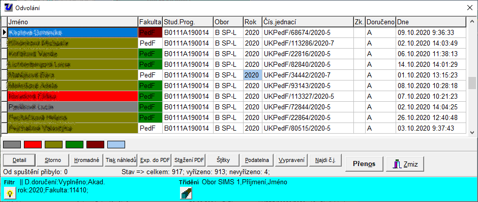 Toto okno nám dává možnost pracovat buď s jednotlivým uchazečem - stisknutím tlačítka "Detail" případně dvojitým kliknutím na příslušném řádku viz Zde, nebo zpracovávat odvolání hromadně.