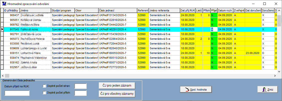 Je možno hromadně editovat údaje pouze u uchazečů, kteří nemají "Uzavřený spis". Pokud je již uchazečský spis uzavřen, je možno ho pro práci s odvoláním znovuotevřít v detailu odvolání, záložka Základní informace