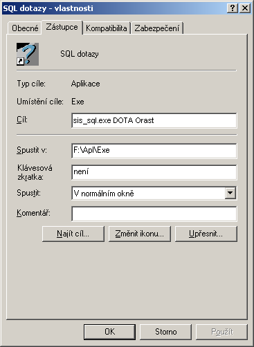 Pro spouštění aplikace je vhodné vytvořit zástupce a přidat parametr DOTA + eventuální BDE alias - viz následující obázek: