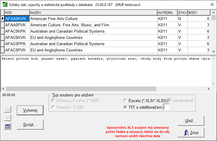 - Poznámka: Pozor na dotazy typu "Vyber všechny uchazeče za posledních deset let..".Může se stát, že při příliš velkém počtu výsledných záznamů se do výsledku uloží pouze jejich část!
