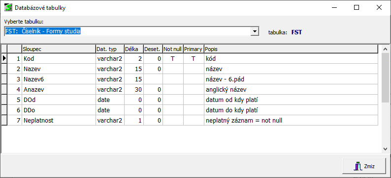 - ikonka Přehled databázových tabulek - otevře okno, ve kterém je možno prohlížet strukturu jednotlivých tabulek databáze s následujícími zobrazenými položkami:
