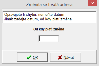 - Změny údajů v rámci trvalé / kontaktní adresy se evidují společně, tj. při změné kterékoli z položek adresy se zaeviduje datum změny do samostatného okna. Tlačítkem se sluníčkem otevřeme editační okno pro změnu zadaného data.