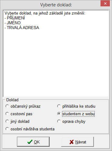 Při změně osobních údajů studenta/uchazeče se u níže uvedených položek eviduje datum změny a doklad, na jehož základě se změna provedla (dále "Důvod změny").