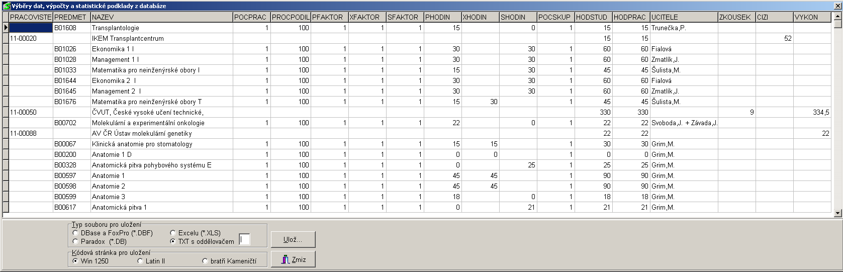 - PRACOVISTE - kód pracoviště - řádky s vyplněným pracovištěm jsou součtové z předmětů, kterým jednotlivá pracoviště garantují výuku