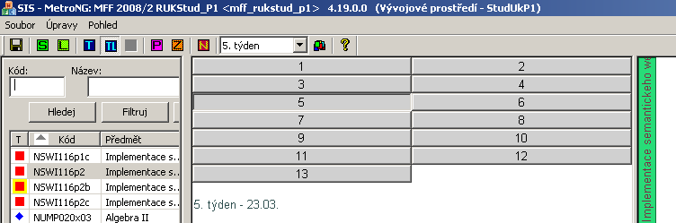 Pro týdenní mód je je plocha rozvržená stejně, jako v popisu Rozvržení plochy. Zobrazený rozvrh a veškeré provedené změny v tomto módu se týkají právě toho týdne v semestru, který je zobrazen v levém horním rohu - viz následující obrázek: