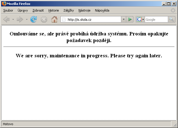 Během údržby systému (typicky změna struktur DB, zálohování, instalace, ...) je možné dočasně odstavit WWW moduly IS STUDIUM. Tento stav lze nastavit dočasným přejmenováním souboru connect.inc. Po ukončení údržby je nutné daný soubor vrátit zpět.