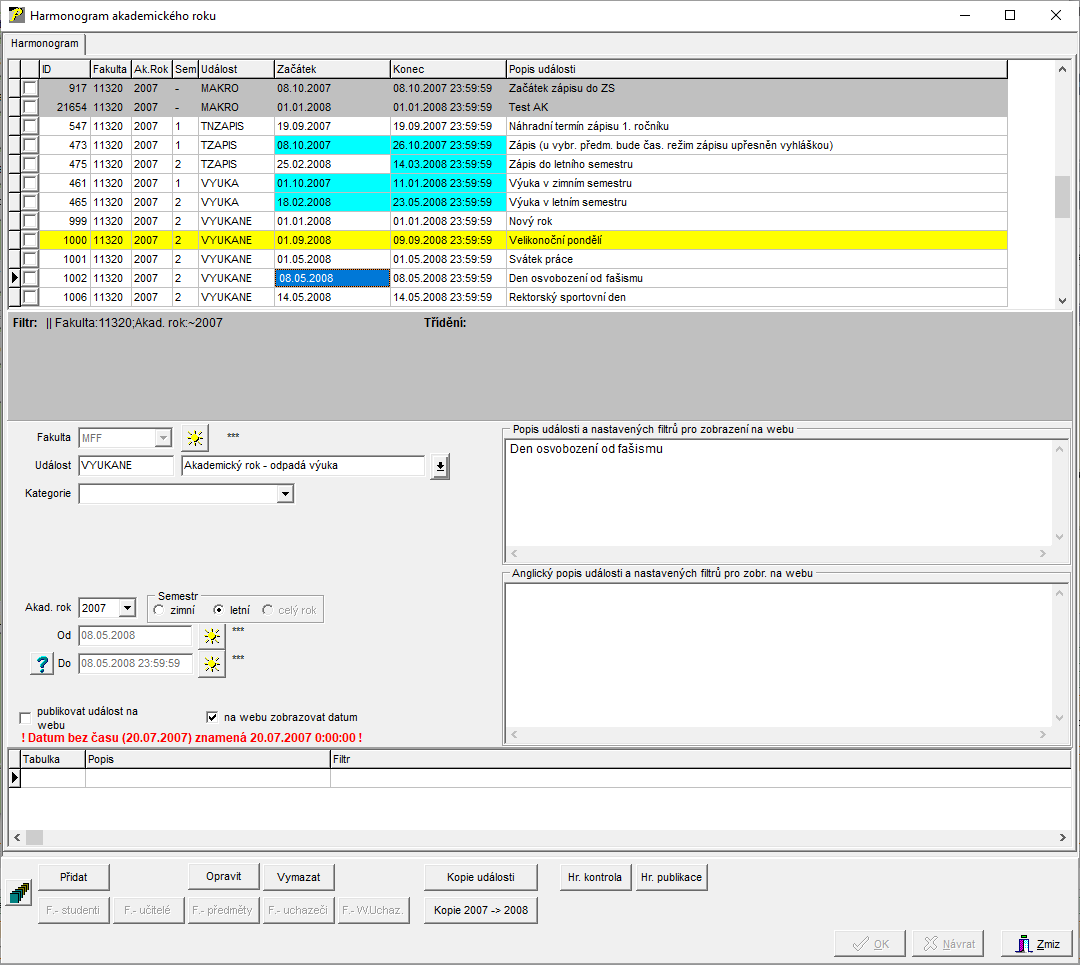 - Hr.Publikace - kliknutím na toto tlačítko nastavíte hromadně vlastnost publikovat událost na webu pro všechny události, které jsou ve filtru uživatele (na následujícím obrázku je filtr Akad. rok:="2007" a Fakulta:MFF) a které mají stejnou fakultu, jako aktuální role uživatele. Po provedení tohoto příkazu se zobrazí okno s informací o počtu nastavených událostí.