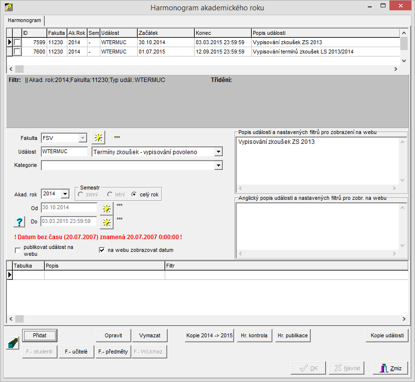 Událost se zadává vždy pro celý akademický rok.