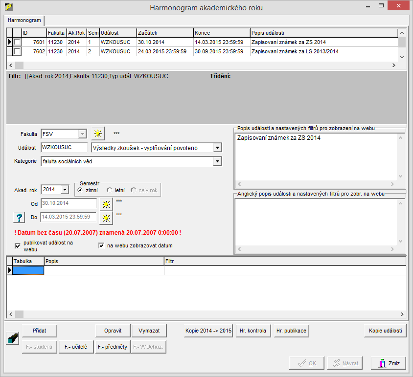 Událost se zadává pro akademický rok a semestr.