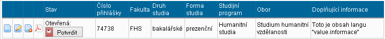 - zobrazuje se v seznamu přihlášek (pro úpravu podmínek spojených s uzavíráním/odesláním přihlášek) ve sloupci Doplňující informace
