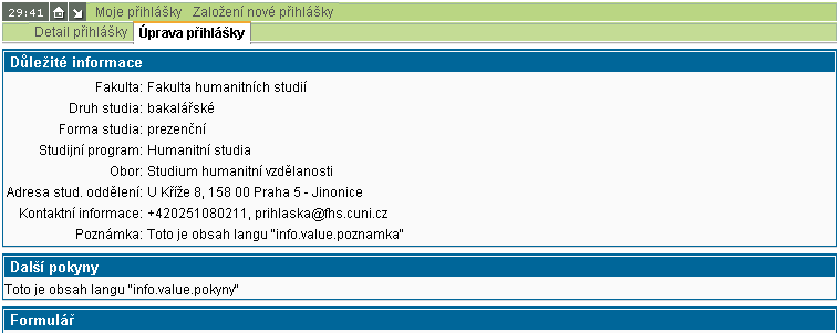 - value.pokyny - obecné pokyny k vyplnění přihlášky konfigurovatelné na fakultní úrovni