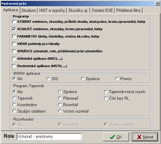 - přidat roli - otevře okno Nastavení práv - viz obrázek níže, kde je možno definovat novou roli