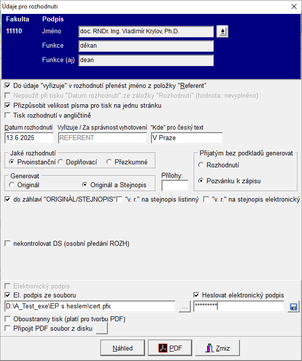 - Stejnopis s "v.r." - je-li položka zatržena, u stejnopisu se za jméno děkana vytiskne zkratka "v. r.".